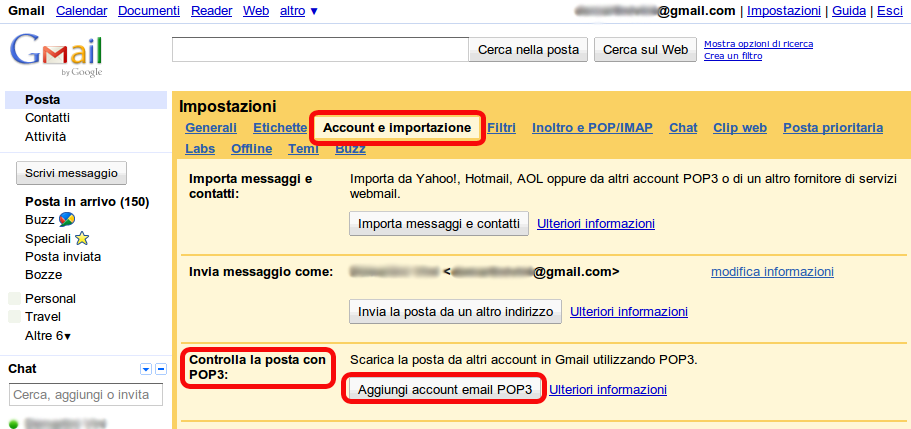 Fortuna che Gmail ci viene ancora una volta in aiuto. E’ possibile infatti usare Gmail per controllare anche altre caselle di posta elettronica in modo da avere un unico posto dove recarsi per vedere se ci sono nuovi messaggi, tenere i propri contatti ed il tutto avvalendosi dei servizi offerti di contorno. Sinceramente non so da quanto sia disponibile tale funzionalità (potrebbero anche essere anni, chiedo scusa in anticipo) ma la trovo fantastica.